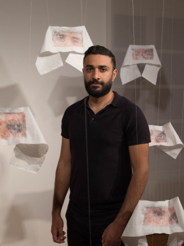 (b. 1991, Ramallah, Palestine) is a visual artist working in performance, installation, and collage, exploring masculinity and the male body in Palestinian society through found images and readymades. He holds an MFA from ENSA Bourges (2018), a BA from International Academy of Arts Palestine (2015), and a diploma from Palestine Film Institute (2010). Solo shows include Zalameh (Zawyeh Gallery, 2019) and Dominance Over the Grass (A.M. Qattan Foundation, 2022). Current residencies: Cité Internationale des Arts, Artagon Pantin, and La Box Gallery (2024).